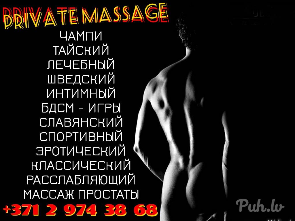 Встречусь с мужчиной 🙋♂️ Есть уютное и тихое место в центре Риги + могу приехать в гости к Вам 🚘 Предлагаю услуги личного массажиста (варианты массажа - от лечебного и спортивного до расслабляющего и эротического) ⚕️ возможен интим (Я в активной роли, орал / анал + по желанию бдсм) ☯️ Звоните / пишите и встречаемся (телефон на фото или внизу) ☎️ Всё качественно и конфиденциально ♥️