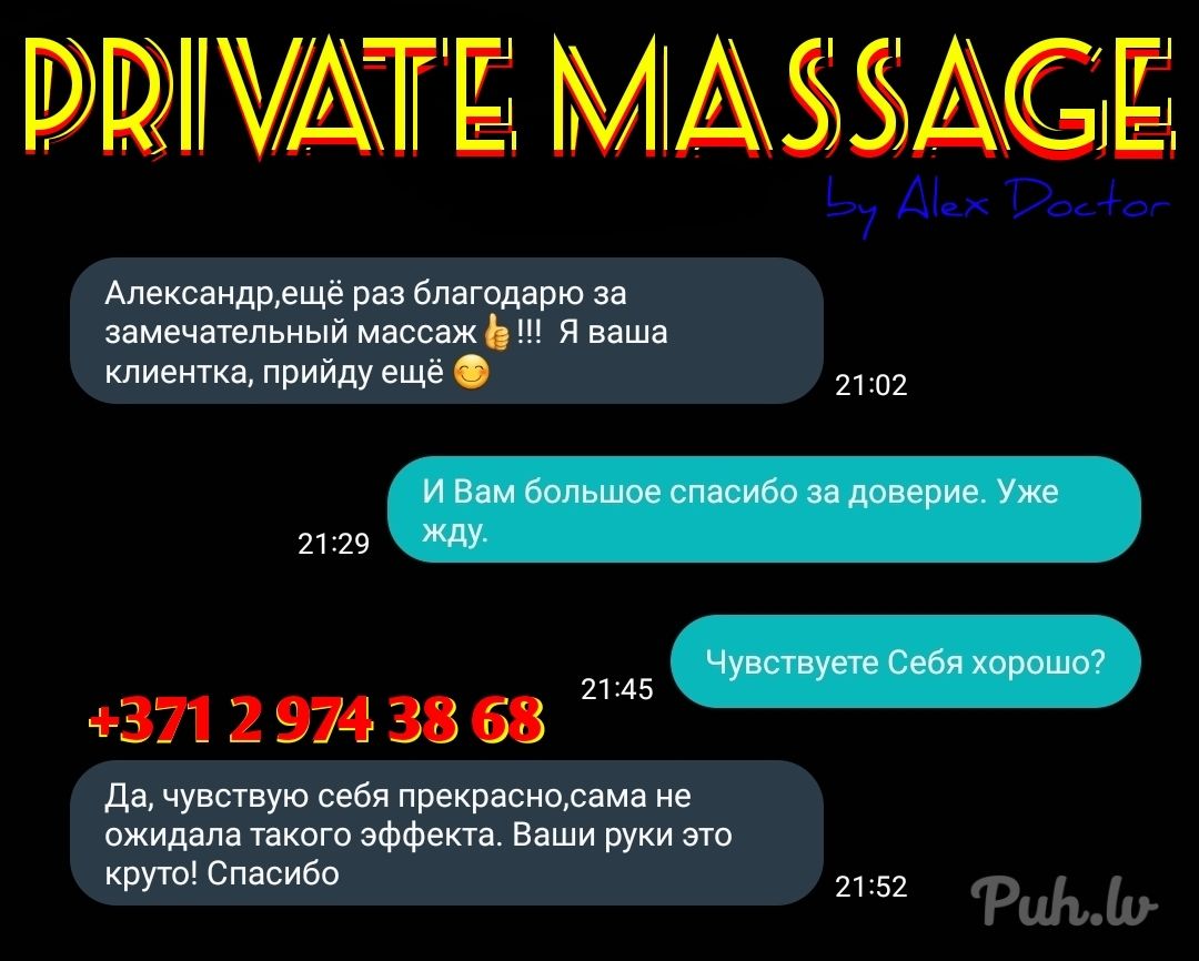 Предлагаю мужчине встретиться для приятного отдыха: делаю качественный и приятный массаж всего тела: эротический ⚕️ оздоровительный ⚕️ спортивный ⚕️ расслабляющий ⚕️ тайский ⚕️ славянский ⚕️ контрастный и другие варианты ♥️ Также предлагаю интим вместе с массажем (можно и без массажа) - (орал/ анал / BDSM) ☯️ Есть уютное место в центре Риги или могу приехать к Вам 🚘 ☎️ Звоните и встретимся, всё конфиденциально ⚡️
